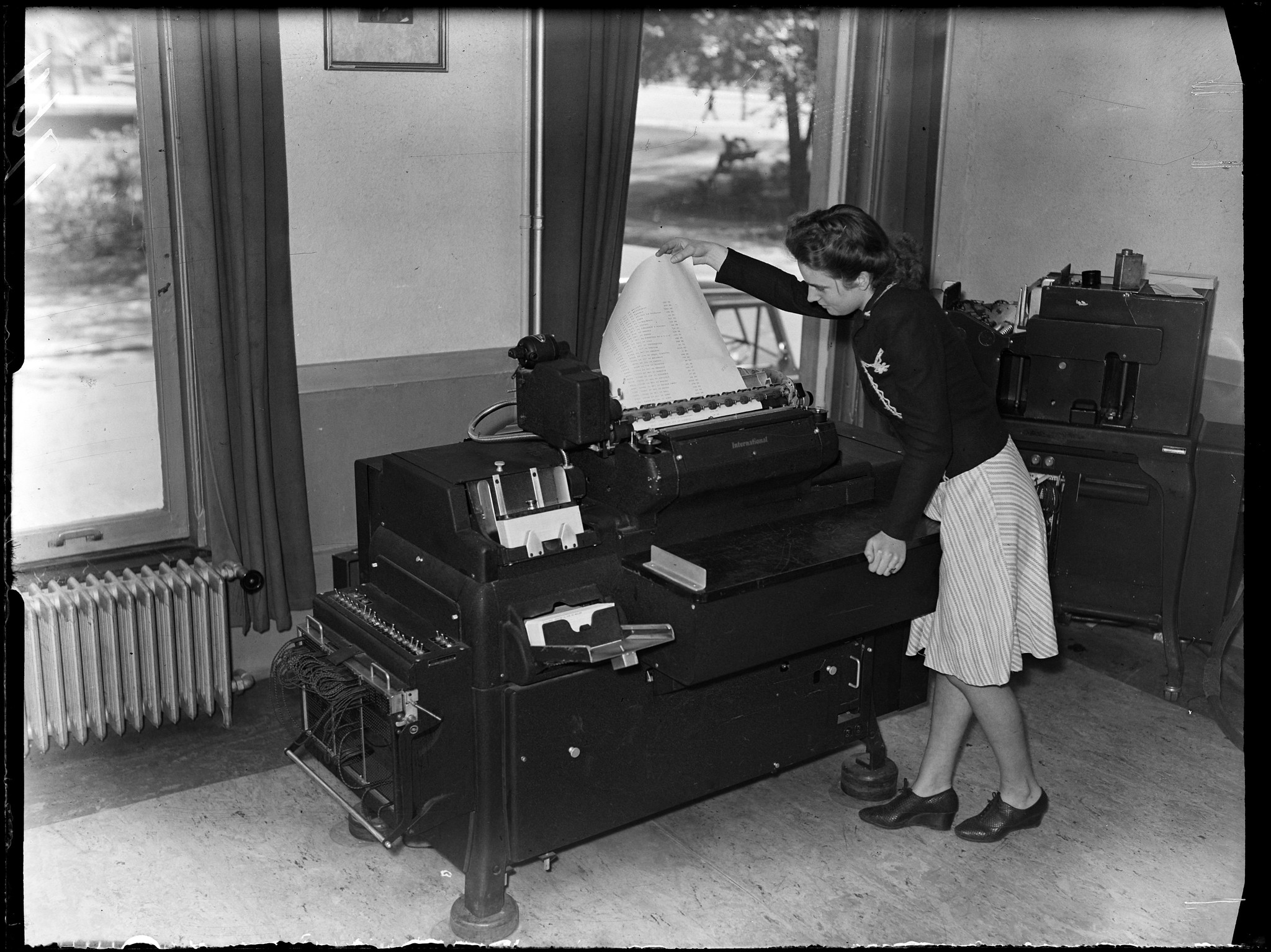 Predecessor to the IBM 402 (despite the higher model number) – The IBM 405: Alphabetical Accounting Machine, introduced in 1934. Photo credit: IISG. Published in De Heerenveense Koerier, May 22, 1947.